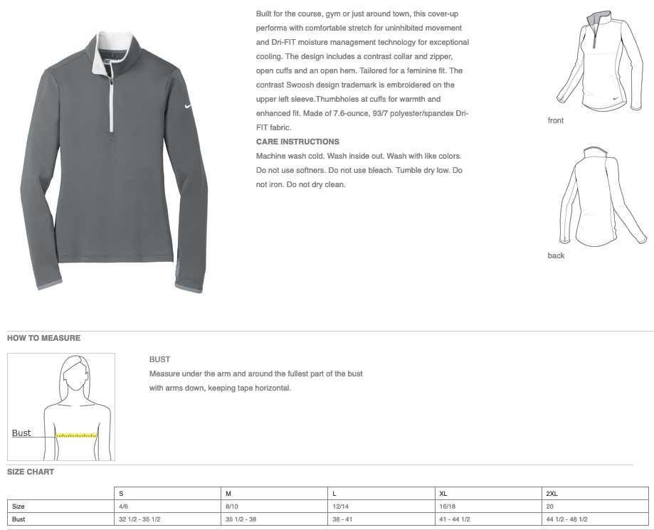 Built for the course, gym or just around town, this cover-up performs with comfortable stretch for uninhibited movement and Dri-FIT moisture management technology for exceptional cooling. The design includes a contrast collar and zipper, open cuffs and an open hem. Tailored for a feminine fit. The contrast Swoosh design trademark is embroidered on the upper left sleeve.Thumbholes at cuffs for warmth and enhanced fit. Made of 7.6-ounce, 93/7 polyester/spandex Dri-FIT fabric.