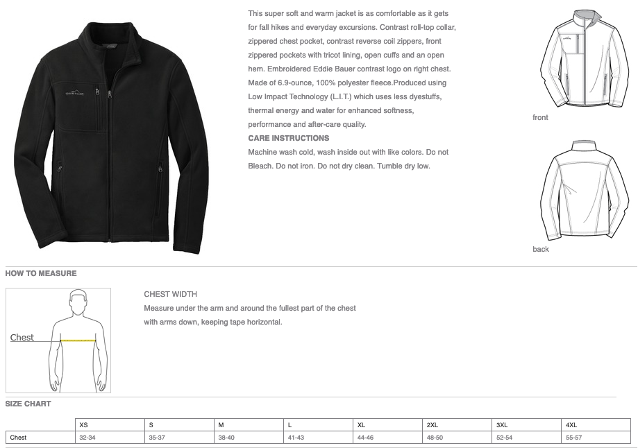 This super soft and warm jacket is as comfortable as it gets for fall hikes and everyday excursions. Contrast rolled top collar, zippered chest pocket, reverse coil contrast zippers, front zippered pockets with tricot lining, open cuffs and an open hem. Contrast Eddie Bauer logo embroidered on right chest. Made of 12-ounce, 100% polyester fleece which incorporates Low Impact Technology™ for enhanced softness and performance.